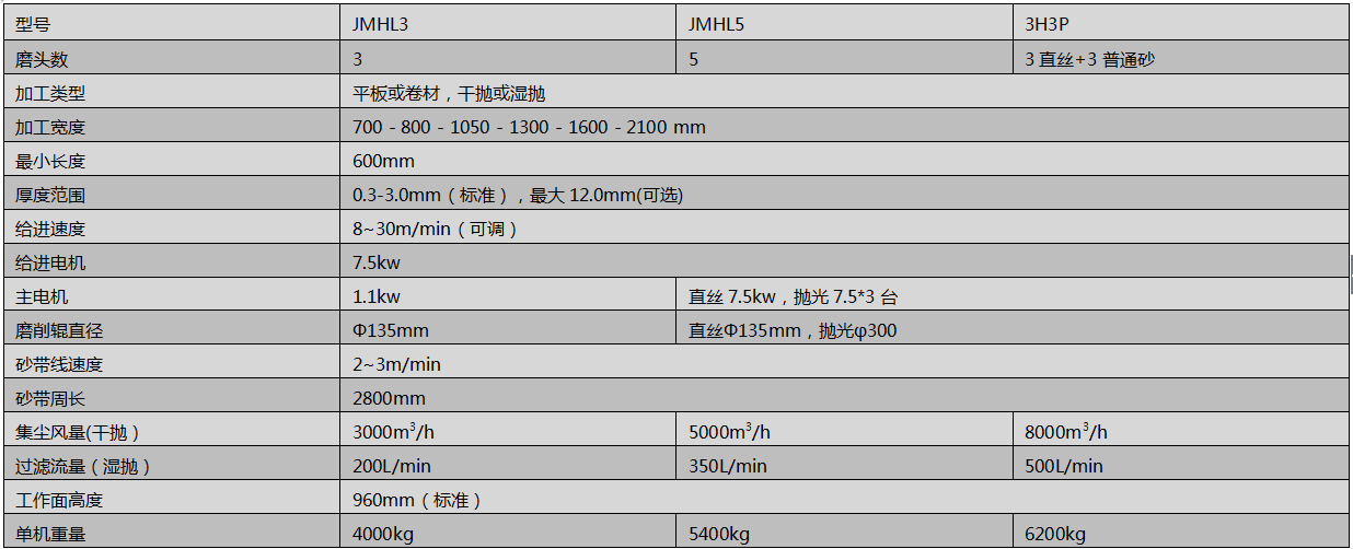 該系列設備有干拋或油拋兩種加工方式。經過轉速極低的砂輥,通過調整砂輥向下的壓力,使套在砂輥外部的環形砂帶在金屬表面拉出直紋。經過機組加工的直絲HL(Hair-Line)金屬板材,表面紋理清晰,縱向2米長度內直紋紋理的偏斜不超過2mm。